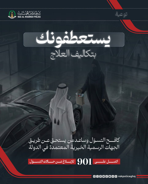 ودعت شرطة رأس الخيمة الجمهور إلى عدم التعاطي مع ممارسي التسول بمختلف أشكاله وسرعة الإبلاغ عنهم والتعاون مع الجهود الشرطية في التصدي لهم.